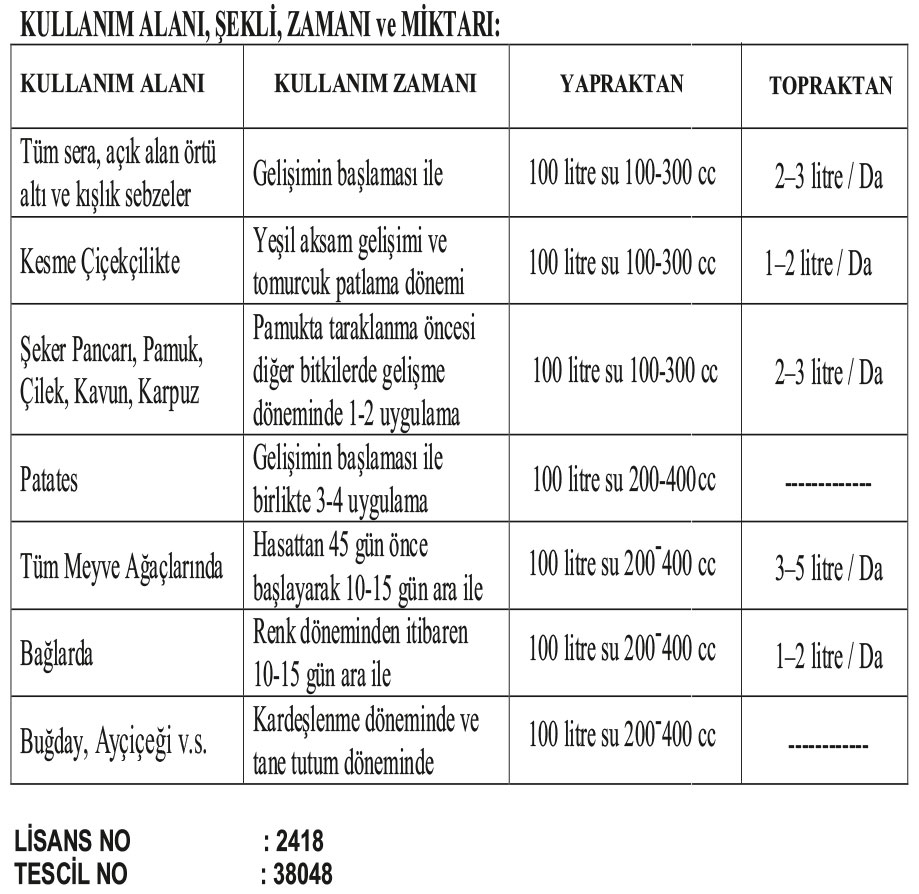 - Çiçeklenme öncesinde kullanıma başlanırsa maksimum döllenme (polinasyon) sağlayarak verimi ve ürün kalitesini artıran kimyasal güçlendiricidir.