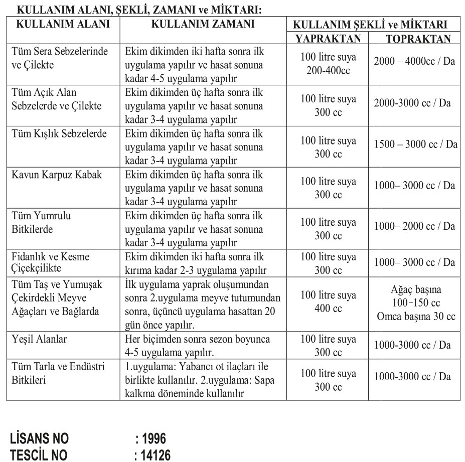 - Dikimden hasat süresine kadar şelatlayıcı organik madde ihtiyacı ve organik karbon bakımından bitkilerin ihtiyaçlarına cevap verir.