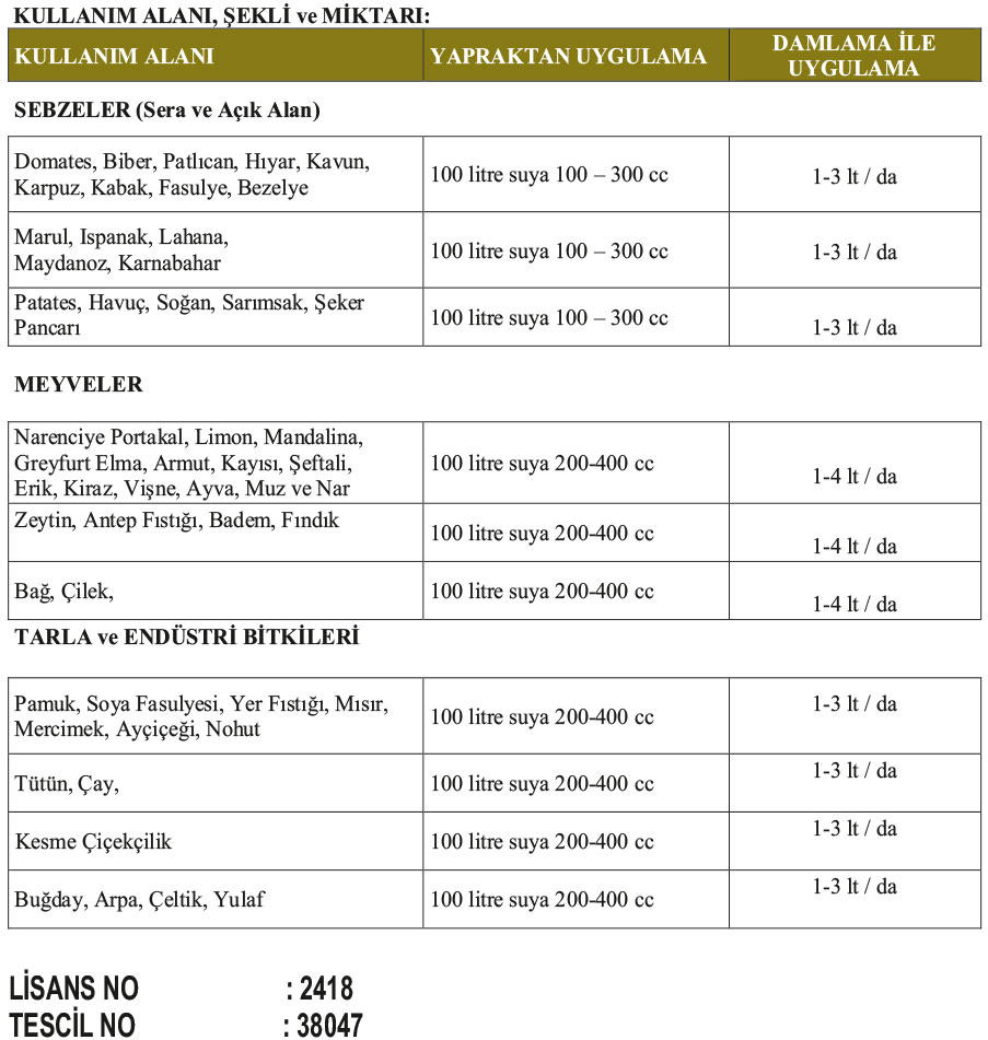 İçeriğindeki 3 farklı azot Amonyum(NH4), Nitrat(NO3) ve Amin(NH2) formlarında azotlar bulunmaktadır.