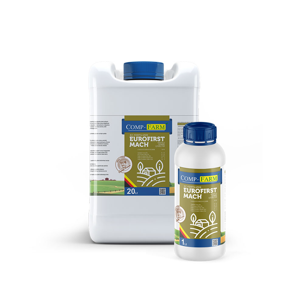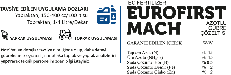 EUROFIRST MACH lactobacillus aminoasit ve organik asit sentezli özel bir amin azotu formudur. pH’ı 2 seviyelerinde olup 3 farklı azot formunu ihtiva eden bitki tarafından kökten ve yapraktan kullanımında karbon hidrat kullanımına gerek duyulmadan kolayca kullanılan azottur.