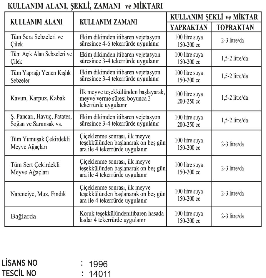- Zenginleştirilmiş iz element içeriği sayesinde bitkinin ihtiyaç duyduğu elementleri dengeli bir biçimde bitkinin kullanımına sunar ve noksanlıkların giderilmesini sağlar.