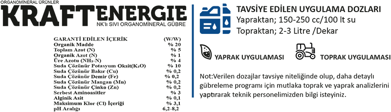 KRAFT ENERGY; içeriğindeki organik madde muhtevası nedeniyle topraktan uygulandığında kullanıldığı toprağın organik madde miktarını artırır. İçeriğinde yer alan Hümik Asit, Fulvik Asit, Alginik Asit, Giberellik Asit ve Amino Asitler sayesinde bitki üzerindeki etkinliğini gösterir. Bitkilerin ilk gelişim evresinden başlayarak sağlıklı ve hızlı bir kök sistemi meydana getirmesini sağlar. Toprak düzenleyicisi vazifesi gören Hümik Asit içeriği ile pH yüksekliği nedeniyle bitki tarafından alınamayan ve toprakta biriken Fosfor, Potasyum, Demir ve Çinko başta olmak üzere birincil ve ikincil besin elementlerinin çözünmesini temin ederek bitkinin kullanımına sunar.